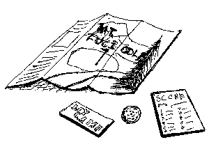 Probably the largest thing in the bottom. This is apt to be the four color glossy brochure. Trim out the uninteresting bits2. Don’t worry if there is dull text. It can be covered up with the score-card or your title or something. On the other hand, if the name of the golf course is predominate and interesting, let it be part of the massage. Mount your score-card on a piece of press board3, -the stuff they use to make file folders works well. While you are about it, mount-up the title if you are using one.